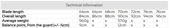 Pružná čepel (praskavý zvuk), rukojeť s rukojetí a kroužek. Ekonomický model, ale kvalitní, vhodný pro trénink jižního stylu