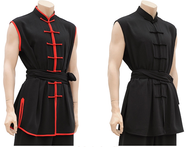 Horní část je dostatečná bez rukávů, límce ve stylu chang quan a zapínání na žabku.