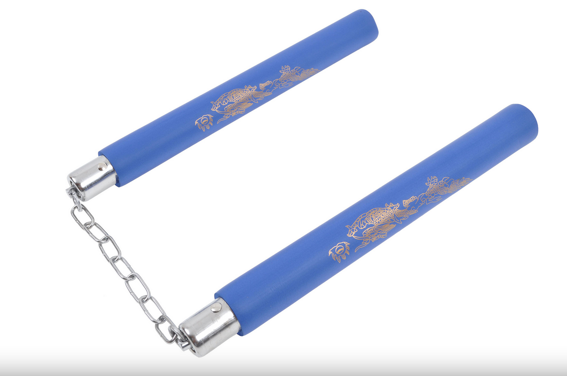Lehké nunčaky, část vyrobená z pěny a spojená řetězem. Dostupné různé barvy a zlatý drak vzor.