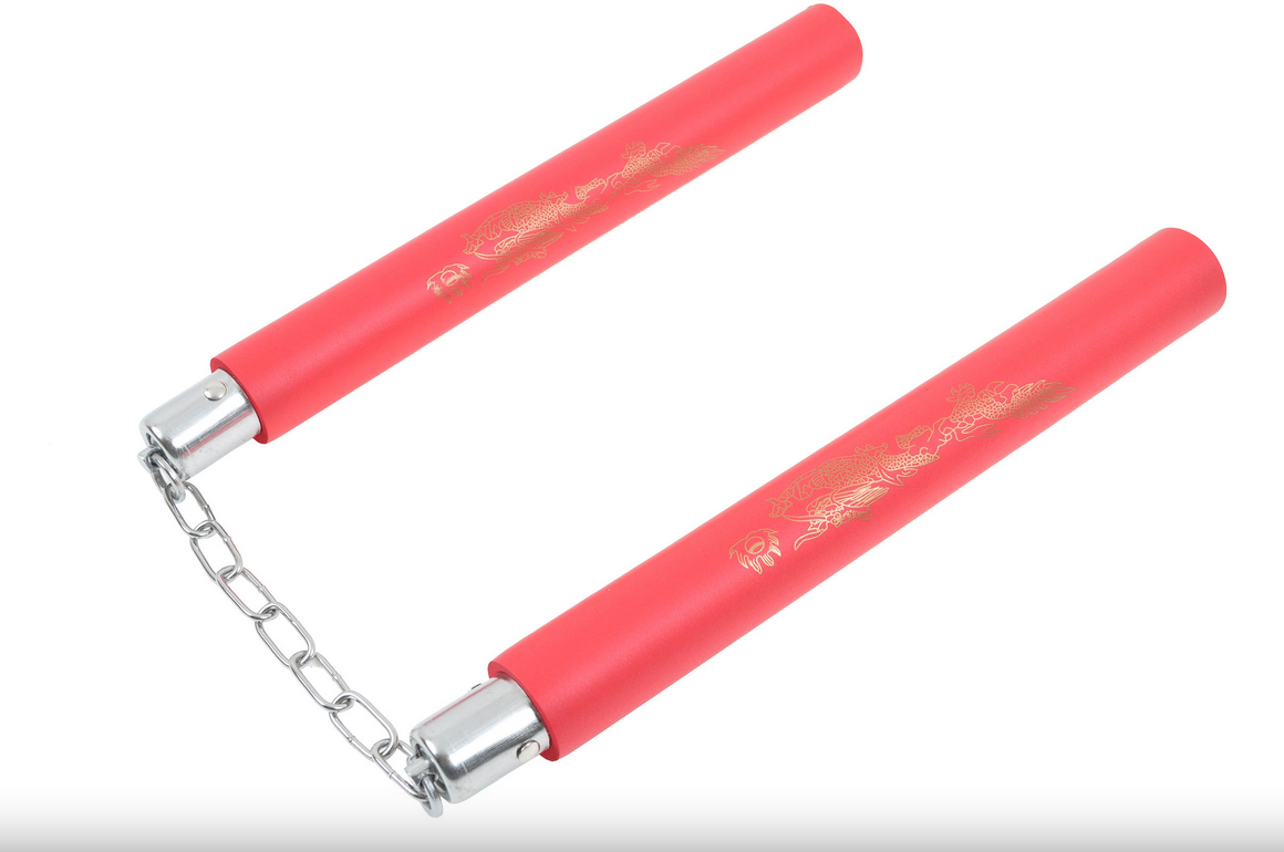 Lehké nunčaky, část vyrobená z pěny a spojená řetězem. Dostupné různé barvy a zlatý drak vzor.