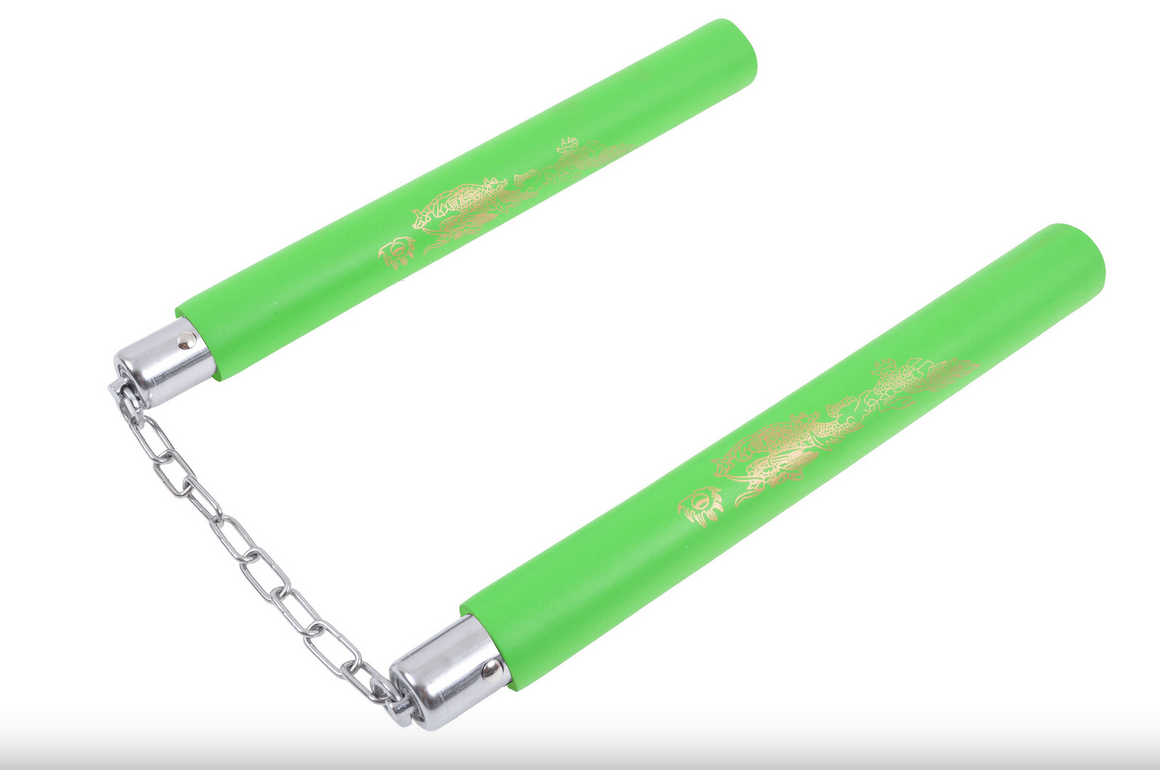 Lehké nunčaky, část vyrobená z pěny a spojená řetězem. Dostupné různé barvy a zlatý drak vzor.