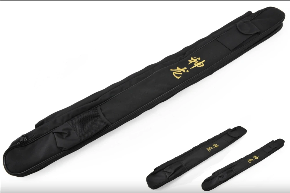 Černý syntetický materiál se zapínáním na zip a nastavitelným ramenním popruhem s vycpávkou. Má dvě samostatné přihrádky, dvě kapsy (jednu se škrábancem a druhou se stahovací šňůrkou (lze ji použít k udržení několika vějířů). Uvnitř můžete zavěsit dvě krátké zbraně. Také vnější dlouhá rozložená kapsa vám umožní nést 210 cm dlouhou hůl.