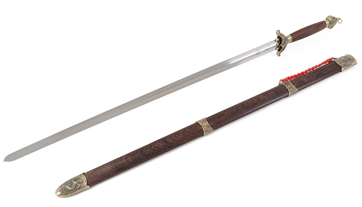 Kované v Longquanu. Jedná se o kvalitní zbraň, k příjemnému a pevnému použití. Čepel je polotuhá a korozivzdorná vyrobená z nerezové oceli, vhodná pro tradiční trénink vnitřního stylu. Na čepeli, rukojeti, chrániči, hlavici a pochvě jsou ozdoby ze slitiny hliníku a mědi.