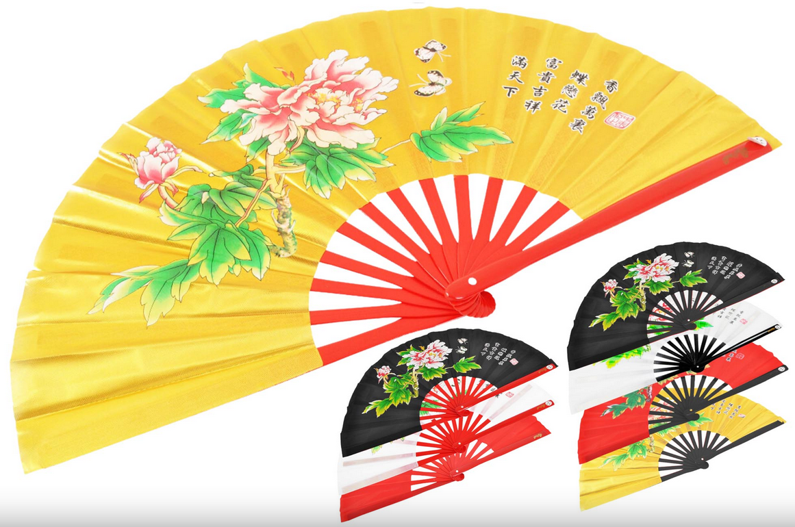 Vějíř tai chi chuan, v čínštině nazvaný «Tai Ji Shan». Stuhy jsou vyrobeny bambusovými barvami a lakovány. Plátno s kresbou květu pivoňky a čínské poezie: