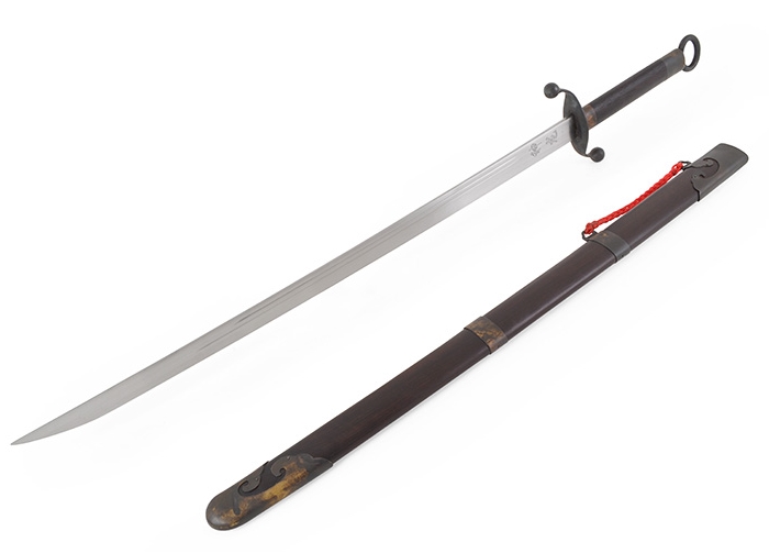 Tuhá čepel z uhlíkové a manganové oceli, měděné a dřevěné části jsou pokryty černou patinou. Vyrobeno v kovárnách Longquan. Toto je široký meč taiji, styl Chen.