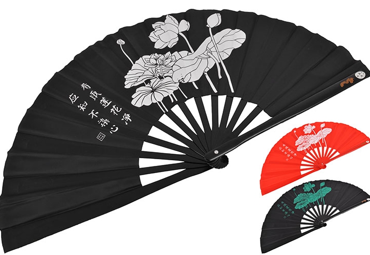 Vějíř praxe tai chi chuan, v čínštině nazývaný „Tai Ji Shan“. Stuhy jsou vyrobeny z lakovaného bambusu. Nylonové plátno s hedvábně potištěným lotosovým květem.
