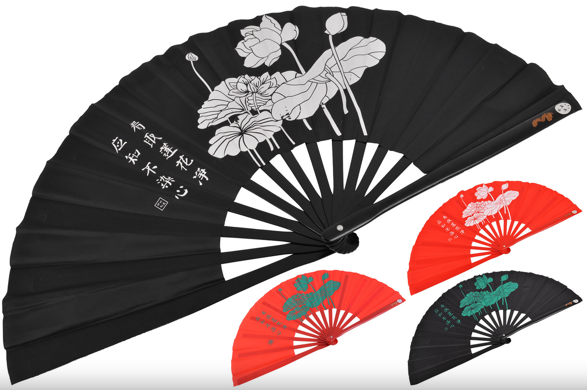 Vějíř praxe tai chi chuan, v čínštině nazývaný „Tai Ji Shan“. Stuhy jsou vyrobeny z lakovaného bambusu. Nylonové plátno s hedvábně potištěným lotosovým květem.