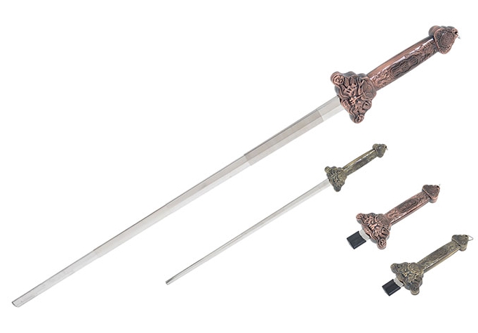 Středový rozsah teleskopického Taiji rovného meče. Zdobená rukojeť (drak), vyrobená ze slitiny mosazného typu. Čepel: nerezová ocel Dvě barvy: bronz a měď. celý popis