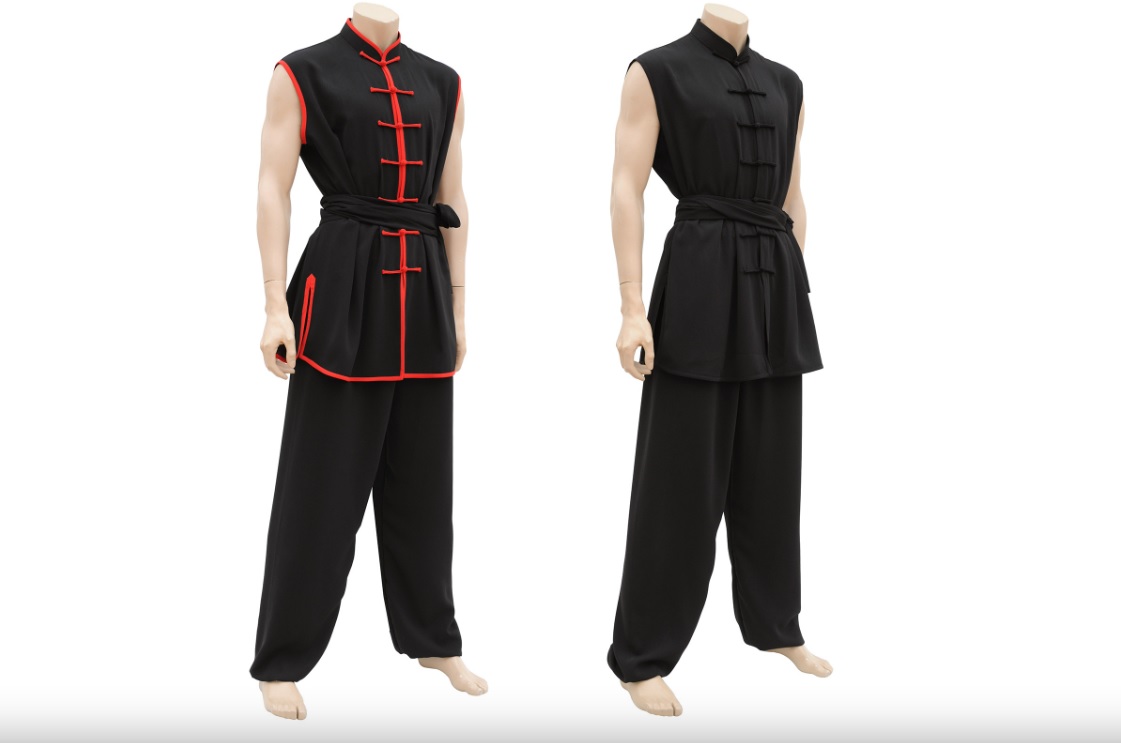 Top bez rukávů, límec ve stylu chang quan a žabí zapínání. A kalhoty mají gumu v pase a žebrovaný kotník.