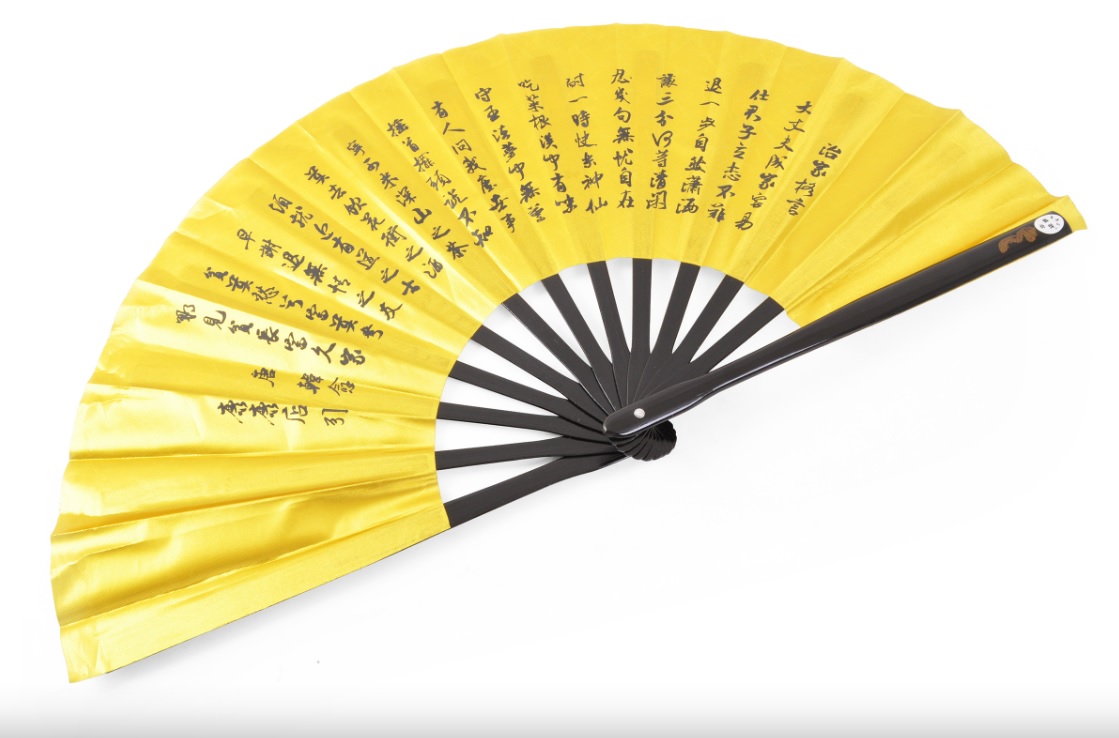 Fanoušek pro cvičení tai chi chuan, nazývaný v čínštině «Tai Ji Shan». Žebrování je vyrobeno z bambusu malovaného a lakovaného. Žluté plátno s černým vzorem.