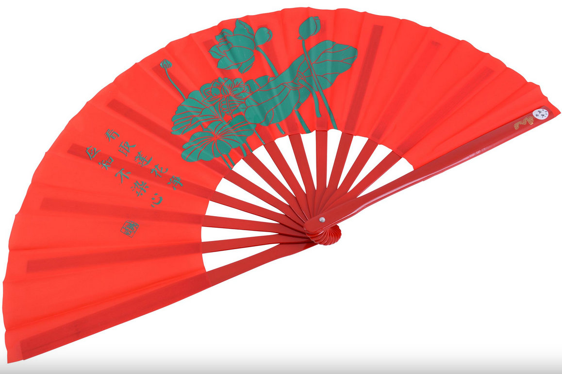 Vějíř praxe tai chi chuan, v čínštině nazývaný „Tai Ji Shan“. Stuhy jsou vyrobeny z lakovaného bambusu. Nylonové plátno s hedvábně potištěným lotosovým květem.